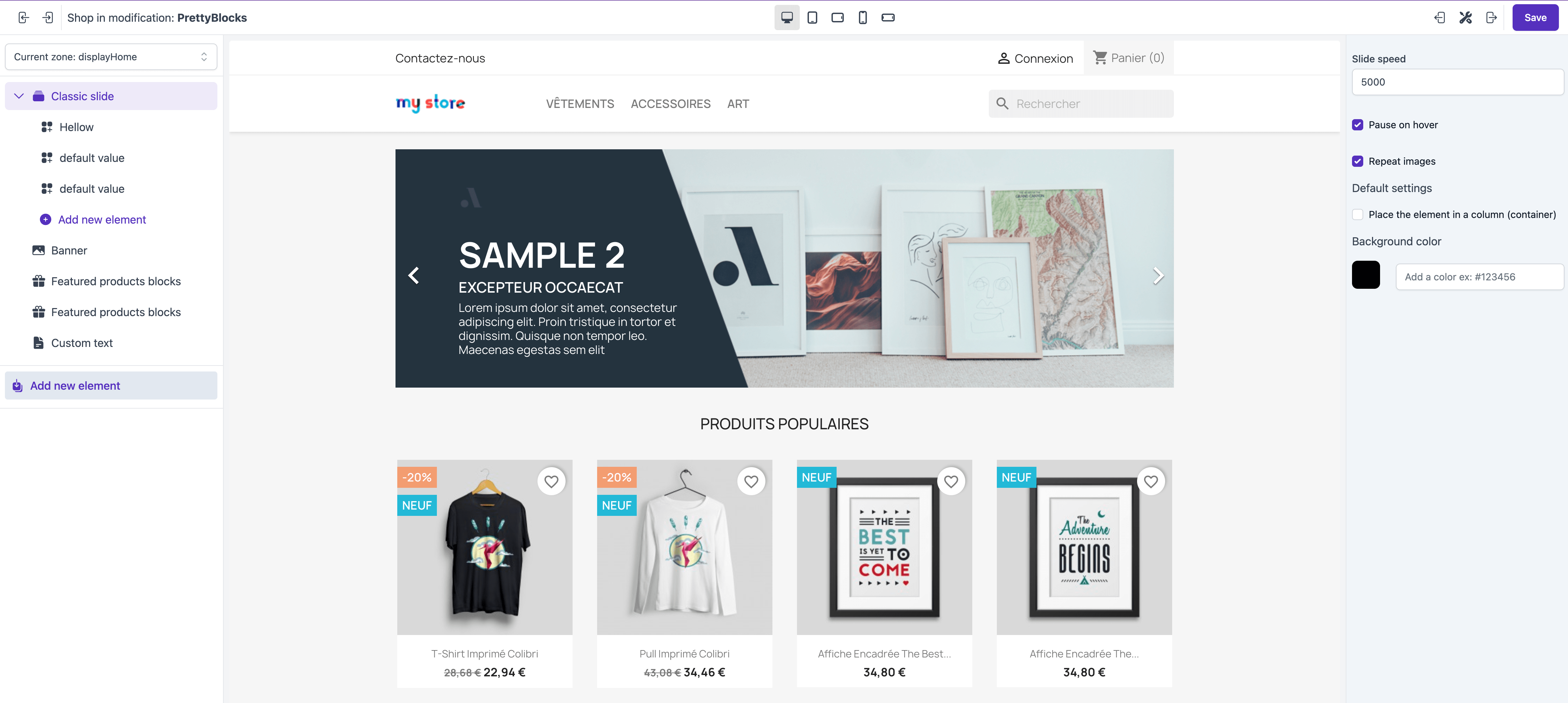 Constatant que dans PrestaShop, un module ne peut être greffé qu'une seule fois sur un hook, nous avons développé PrettyBlocks. Ce système de type Page Builder vise à simplifier la vie des marchands et des développeurs en offrant une solution à la fois innovante et intuitive.